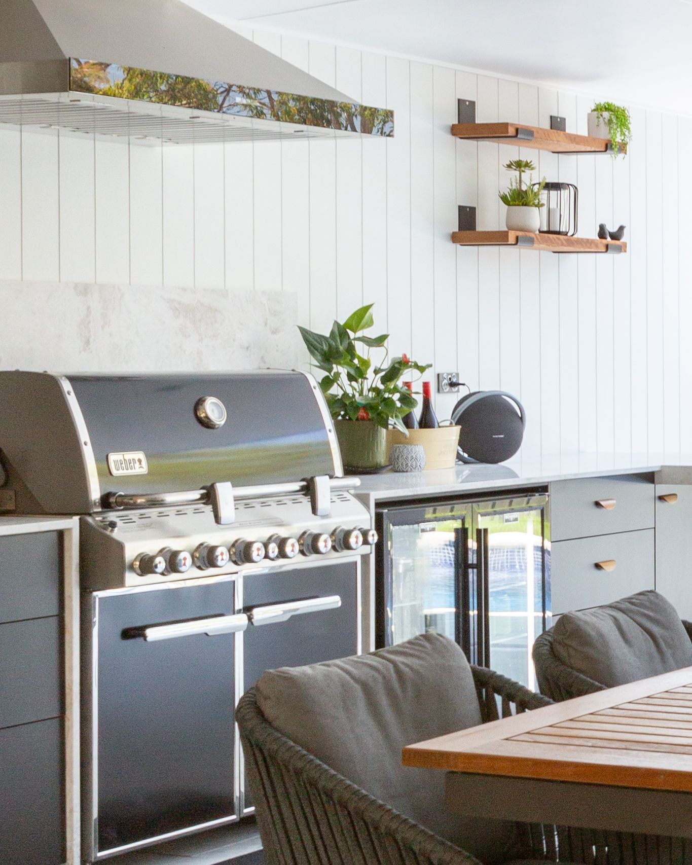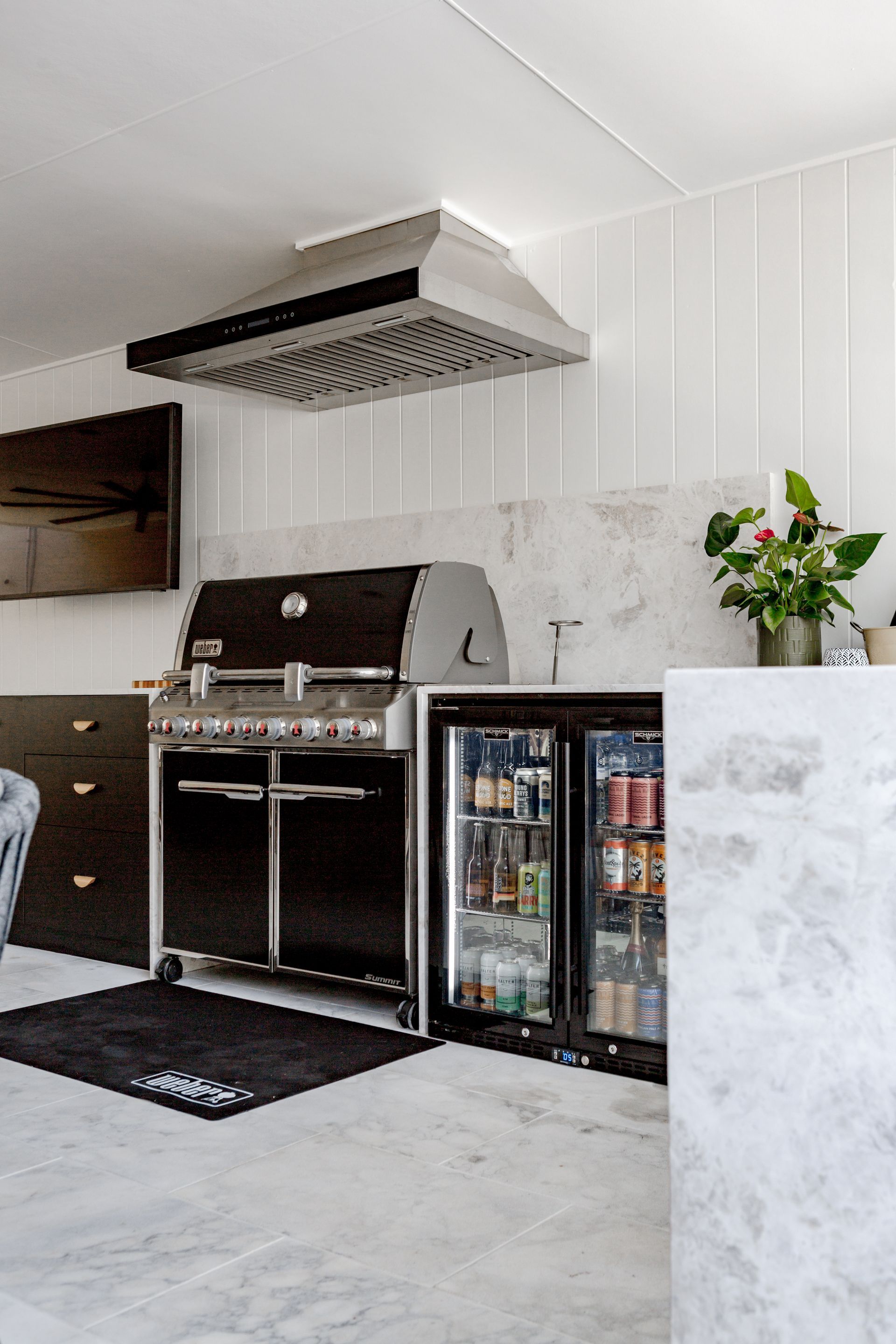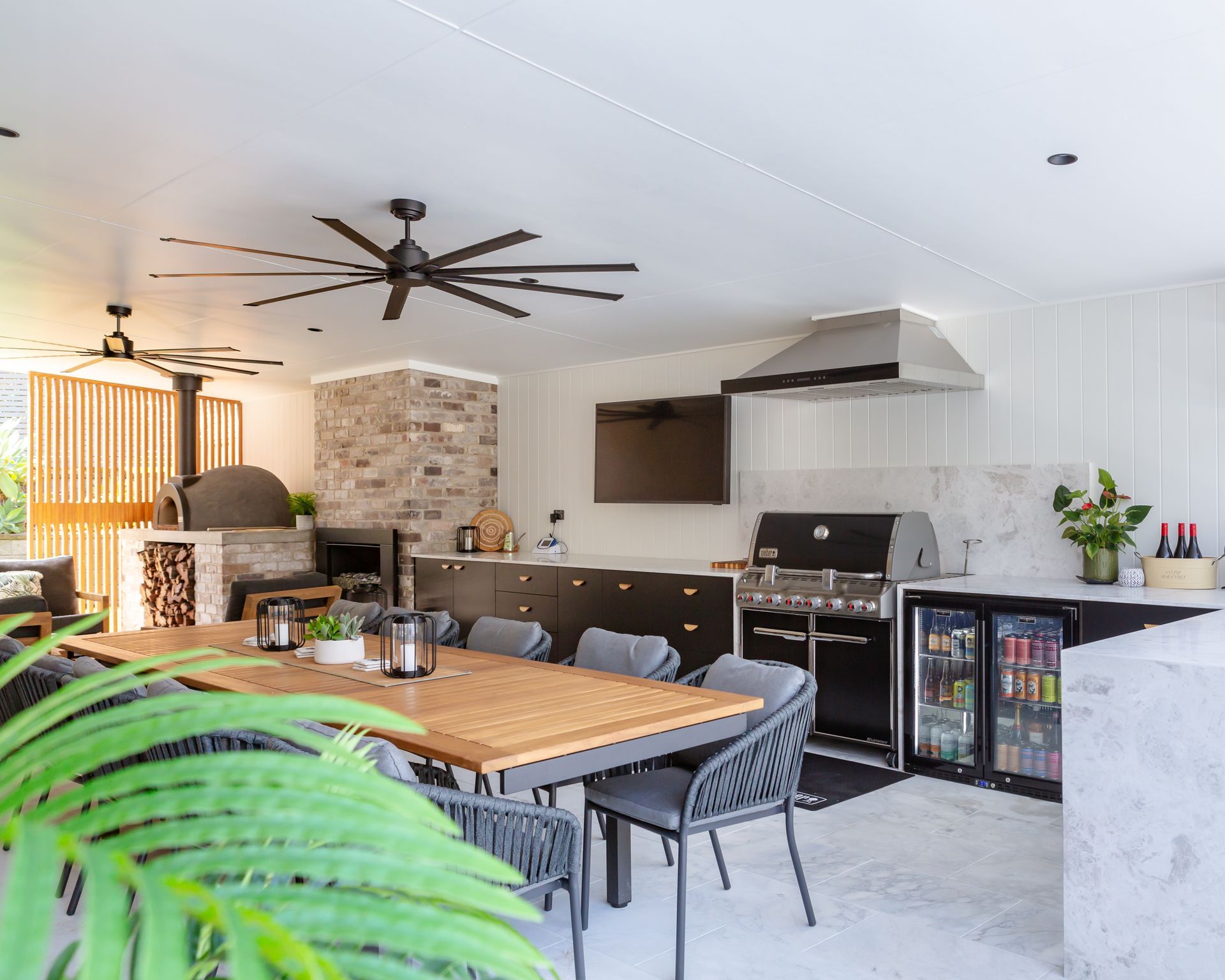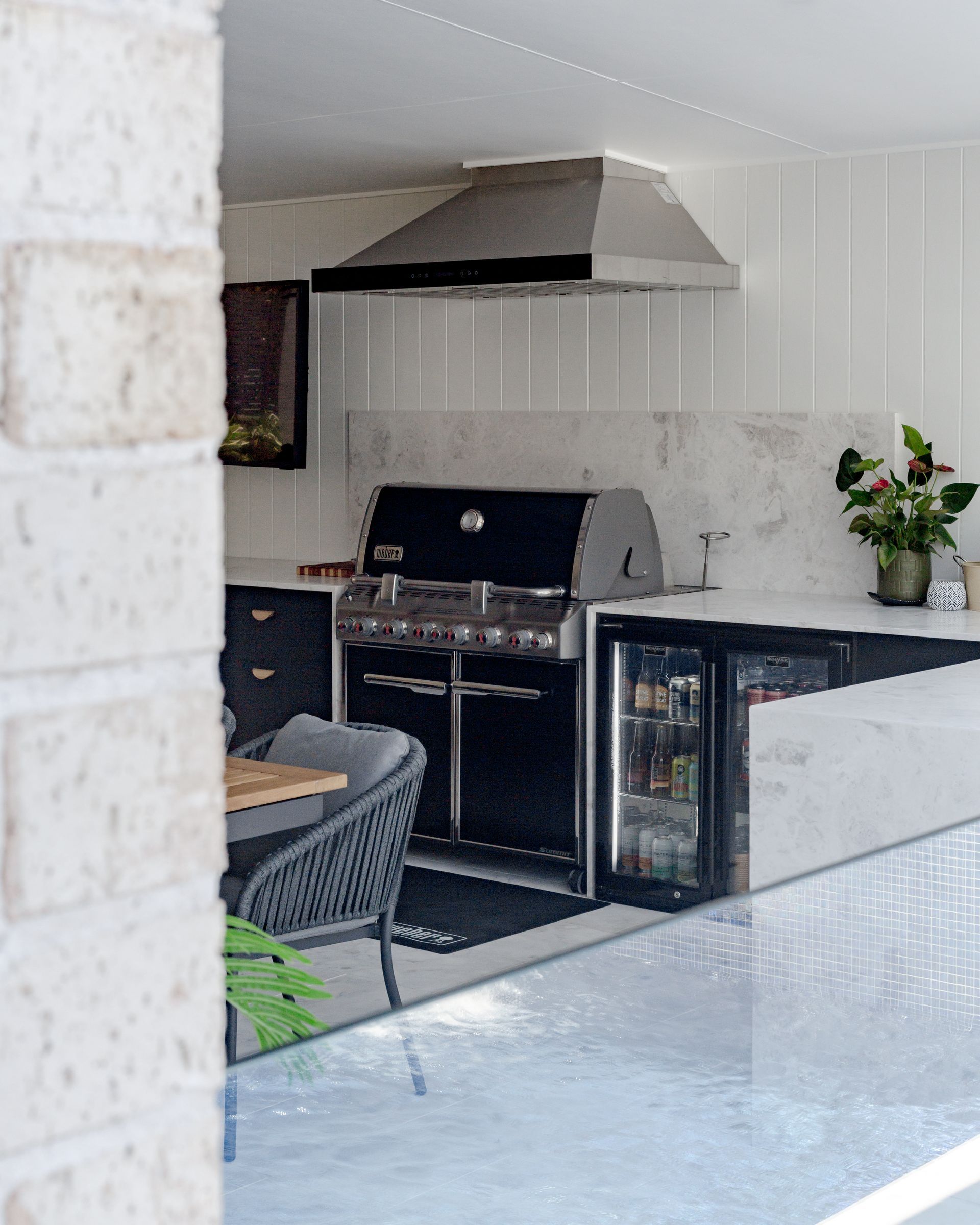 This project was designed by our in-house expert in collaboration with our clients to help create a space that could be utilised all year round and features a built-in pizza oven with a sleek concrete benchtop, complemented by an outdoor gas fireplace and generous island bench and bar seating finished with an incredible natural stone countertop perfect for outdoor weather and to top it off a full sized inbuilt Weber BBQ and beer fridge for those nights and weekends relaxing by the pool.