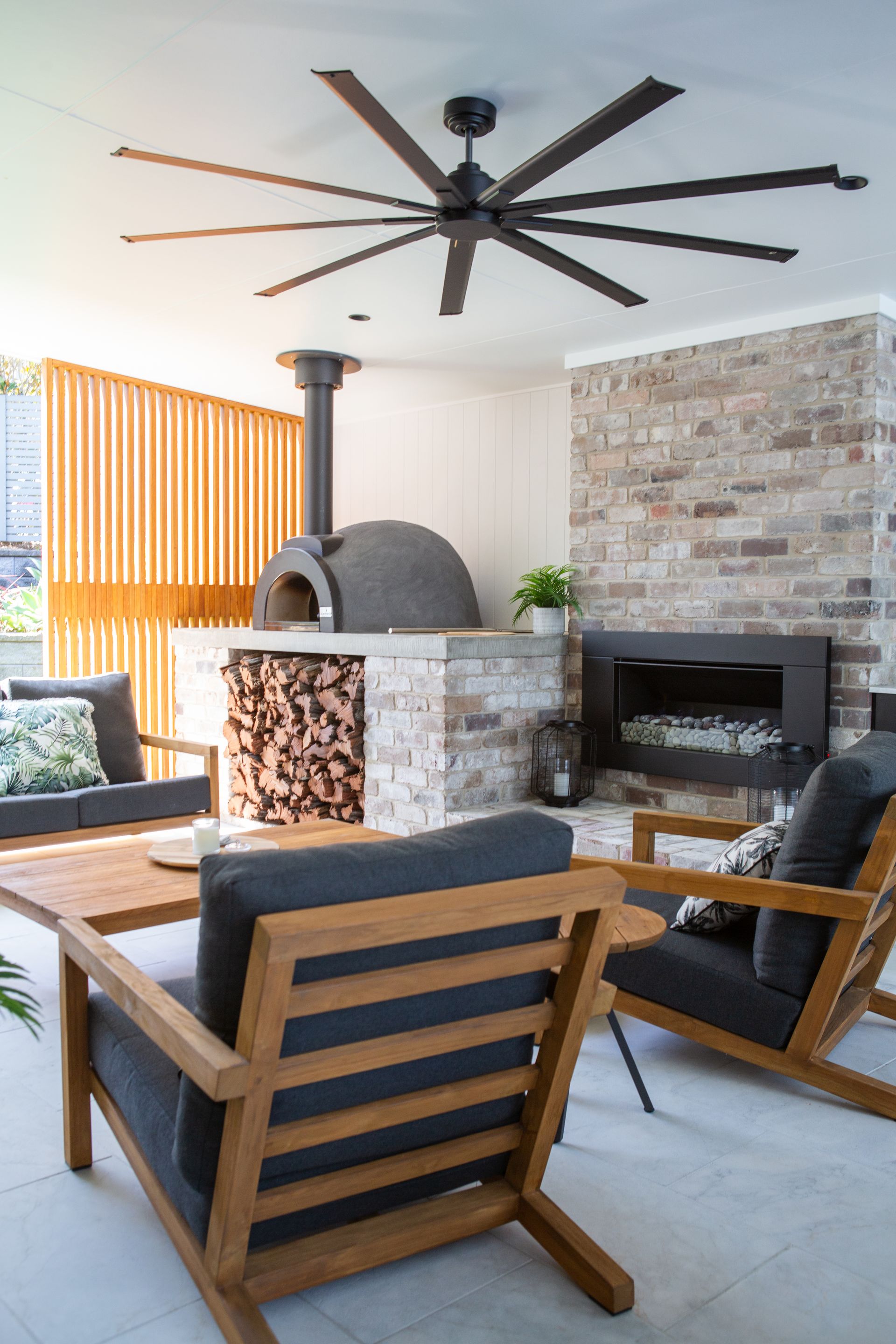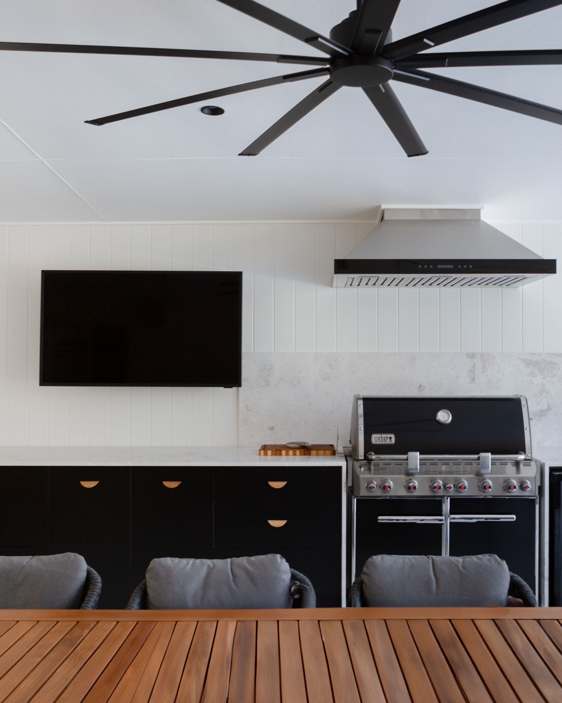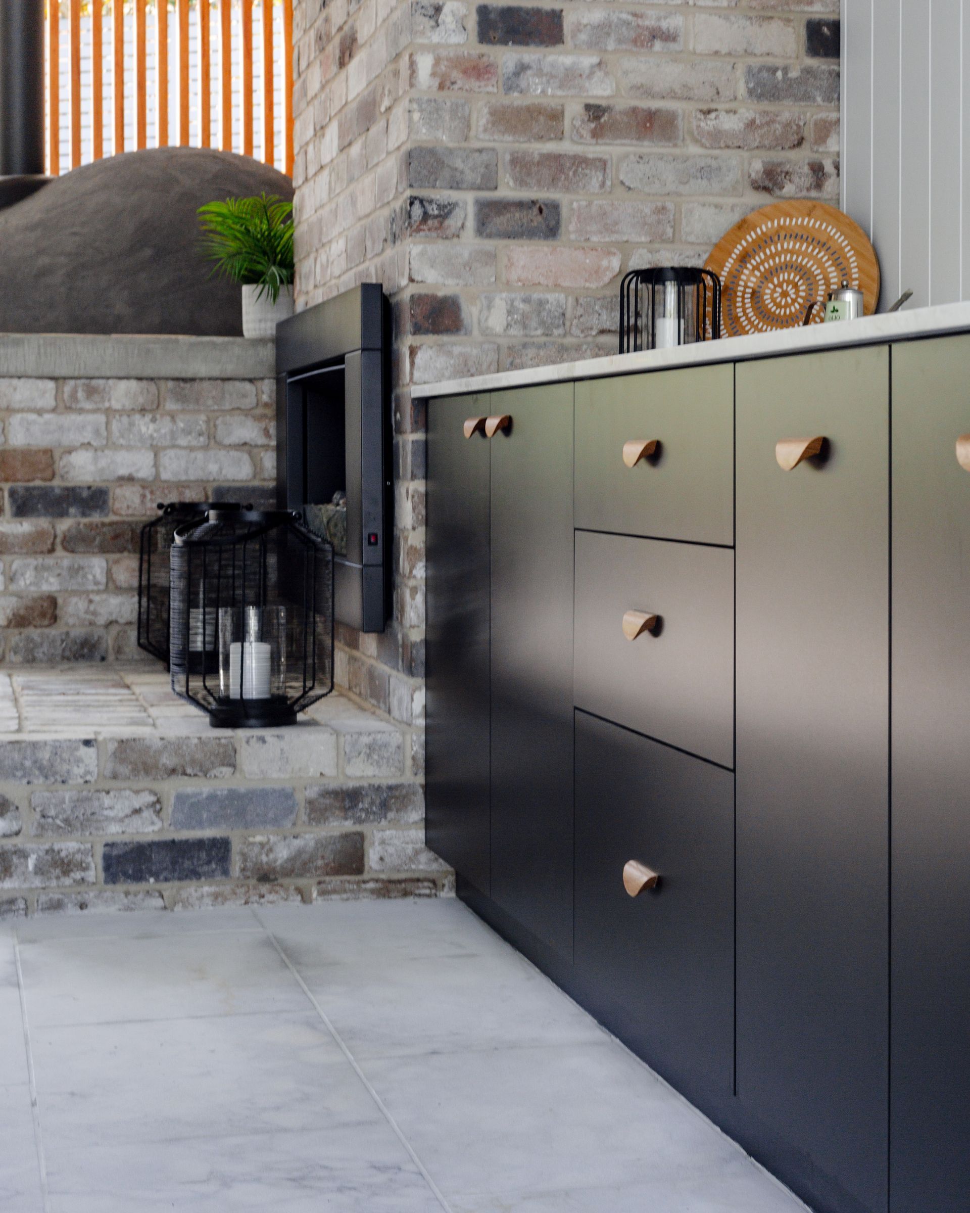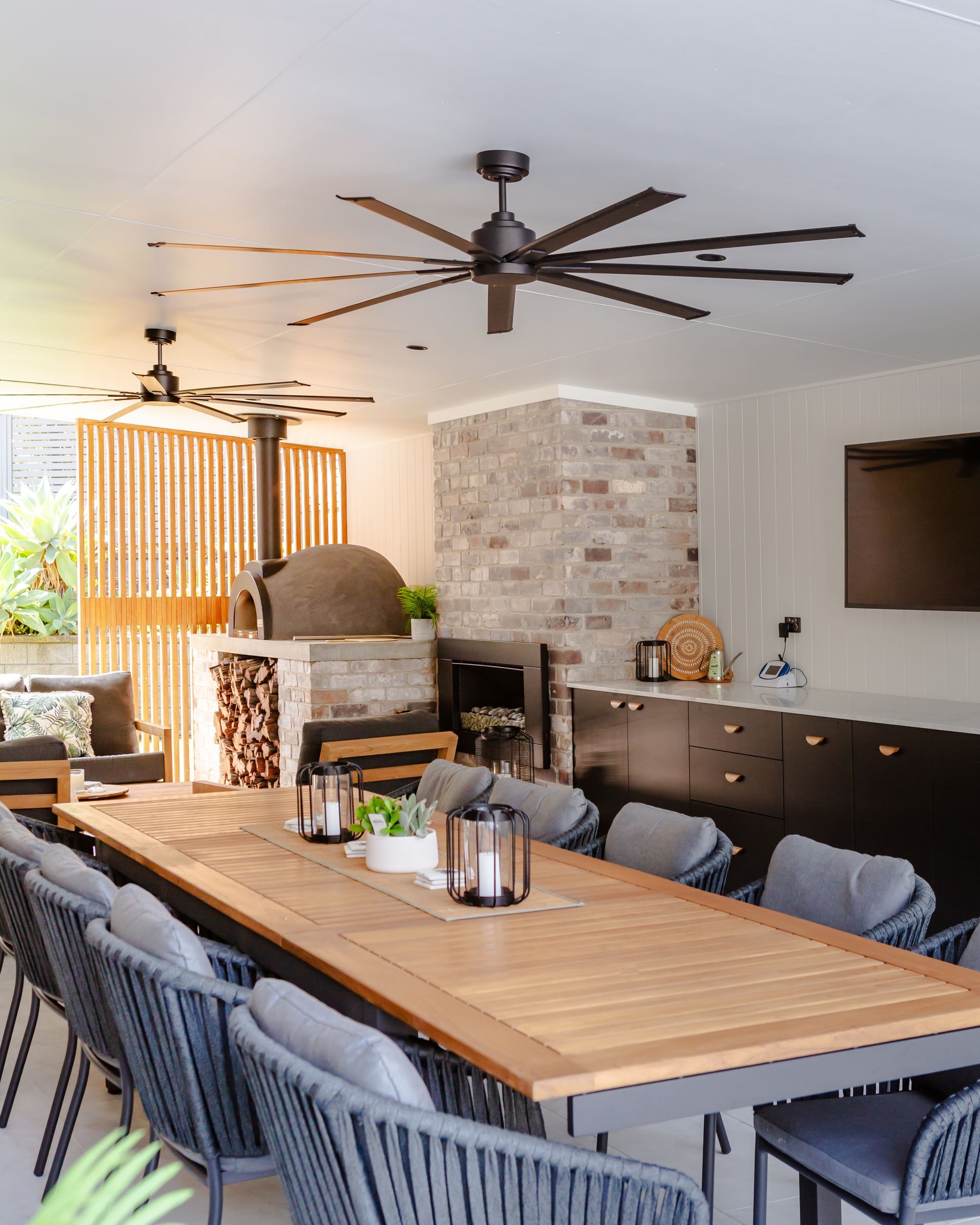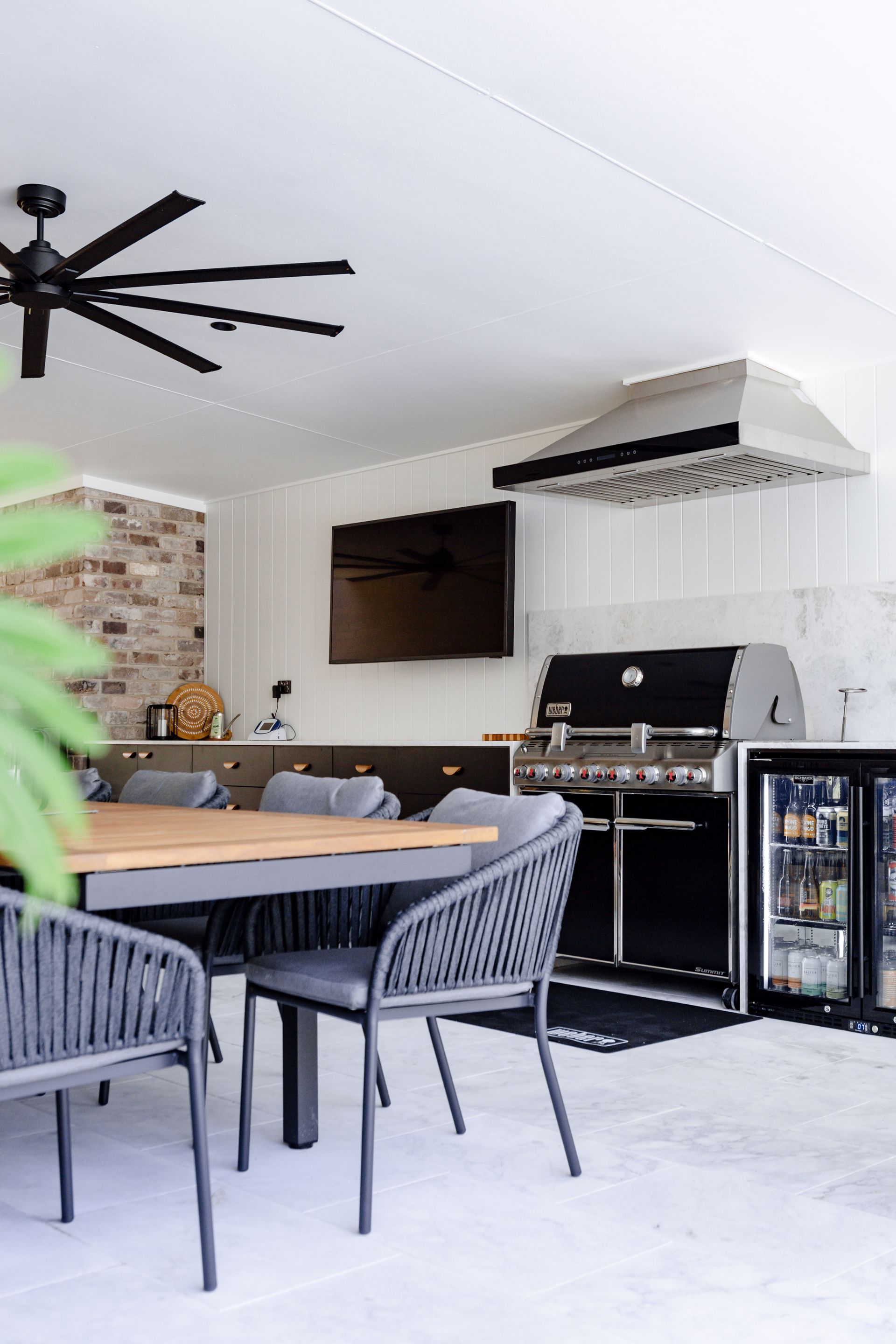 This project was designed by our in-house expert in collaboration with our clients to help create a space that could be utilised all year round and features a built-in pizza oven with a sleek concrete benchtop, complemented by an outdoor gas fireplace and generous island bench and bar seating finished with an incredible natural stone countertop perfect for outdoor weather and to top it off a full sized inbuilt Weber BBQ and beer fridge for those nights and weekends relaxing by the pool.