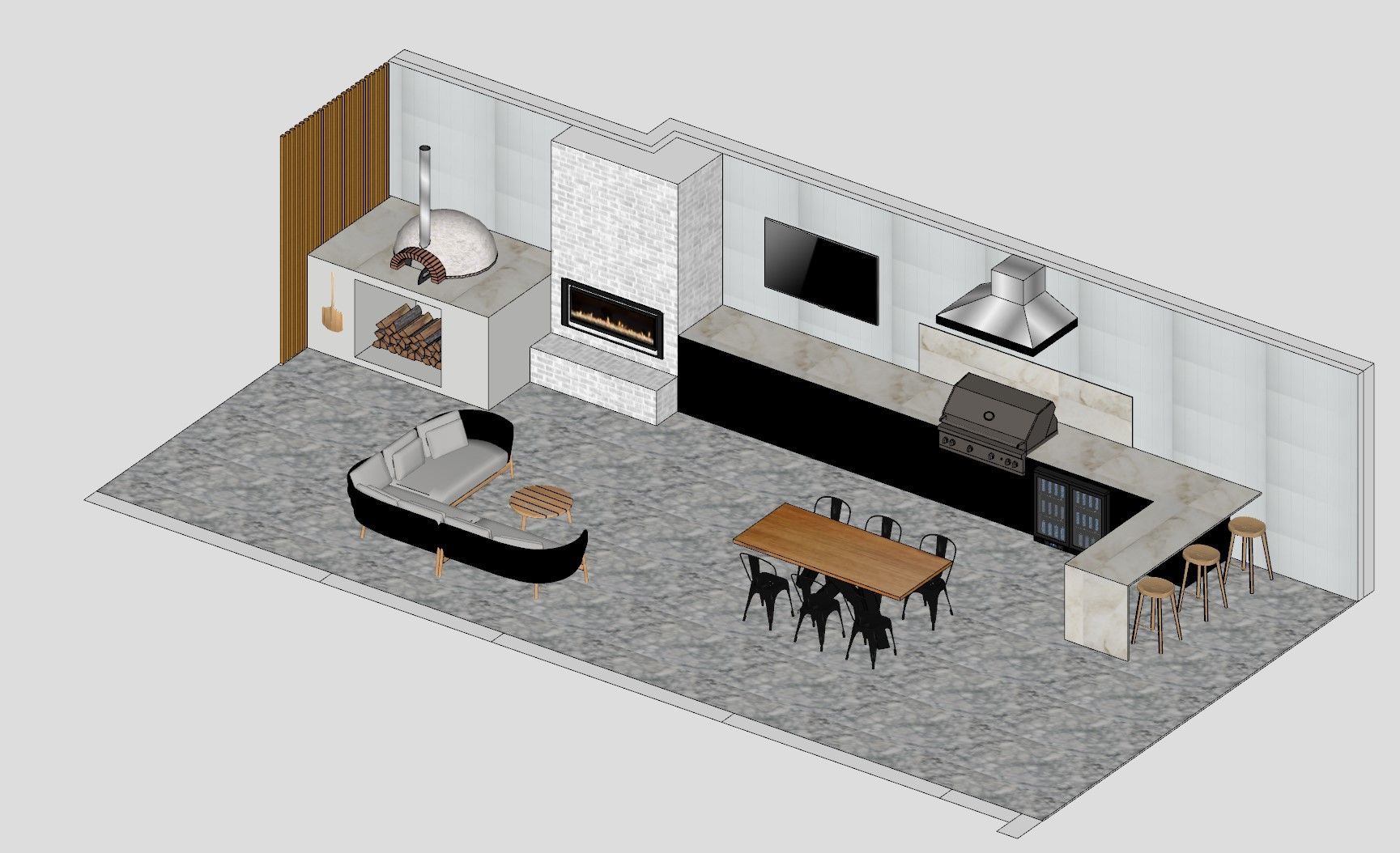 Our clients came to us with the desire to upgrade their backyard with a full custom outdoor living area and were thrilled with the design and build process, and with the construction finish in just seven weeks; In time for Christmas. Since then, Friday night pizza nights have become a cherished tradition alongside their family and friends.