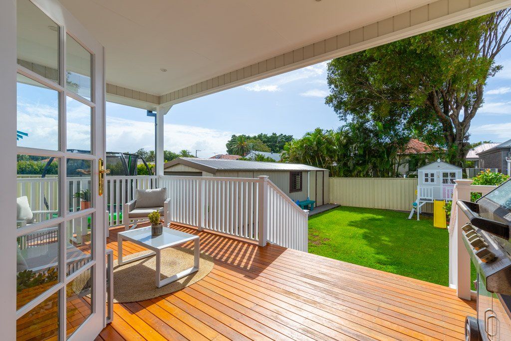 The timber balustrade and stairs are the feature of this back façade. Working with a design of coastal cottage with a touch of Scandinavian style. The timber French doors create an easy flow from the back yard up into the house. With the BBQ in a handy location at the top of the stairs and there is plenty of room to entertain their guests on the new blackbutt hardwood deck