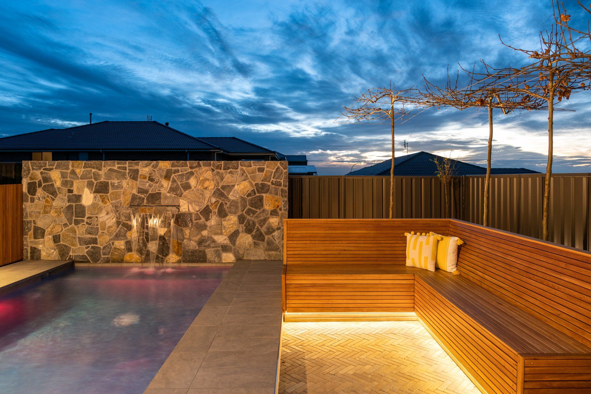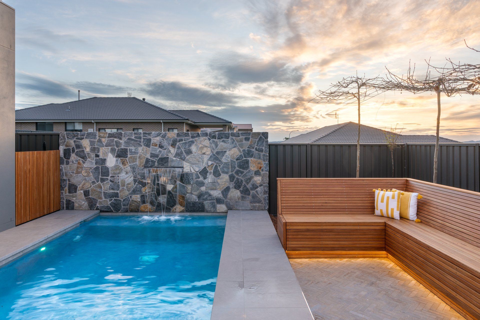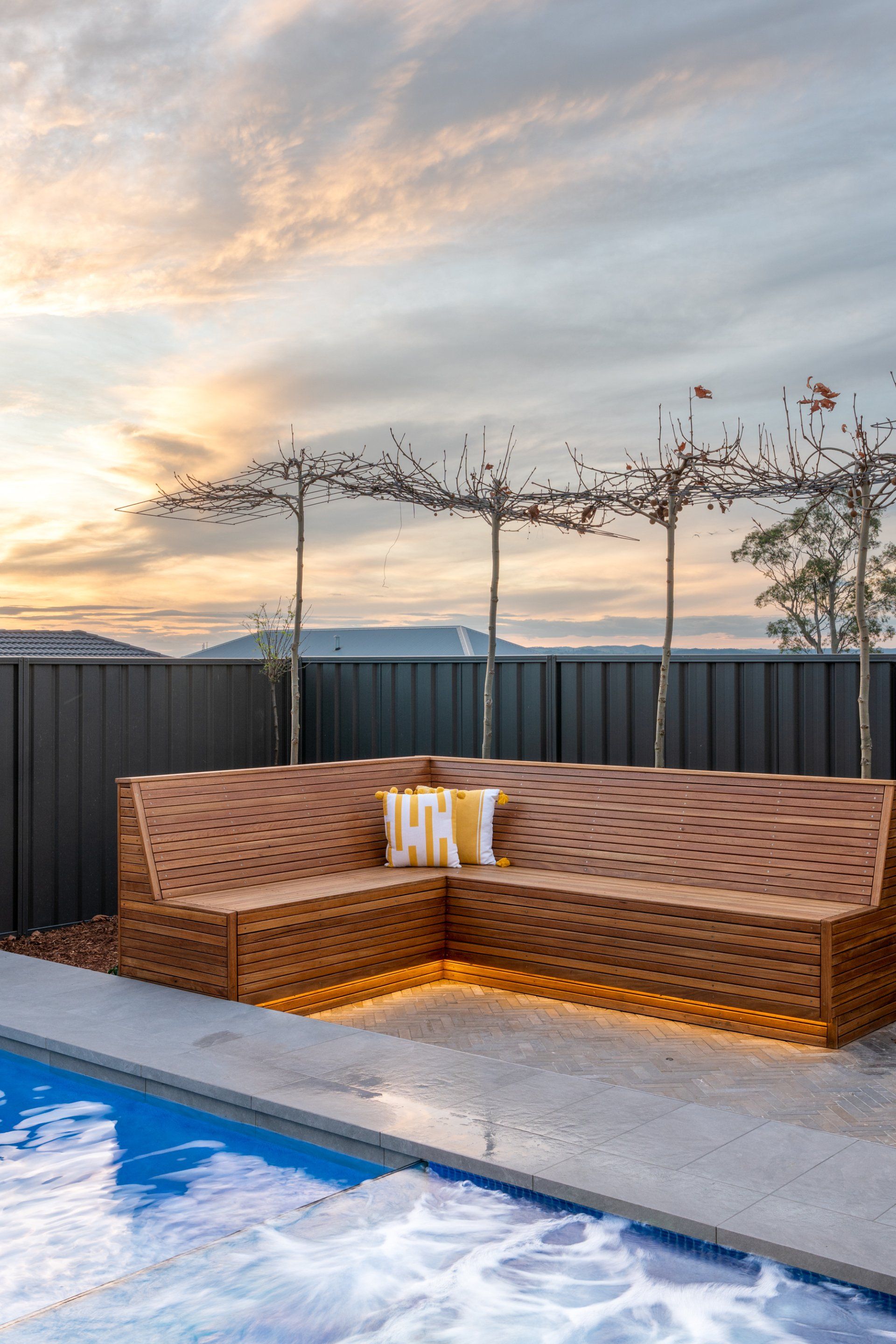 But that’s just the start of it... We completed the day bed seating in the pool area, and the polished concrete fire pit out the back with floating hardwood seating. All the landscaping, paving, fencing, pergola roof and cladding, feature rock cladding, screening etc was designed and completed by our amazing team. We even had our sister company Coastline Pools and Spas do the pool, spa and water feature.