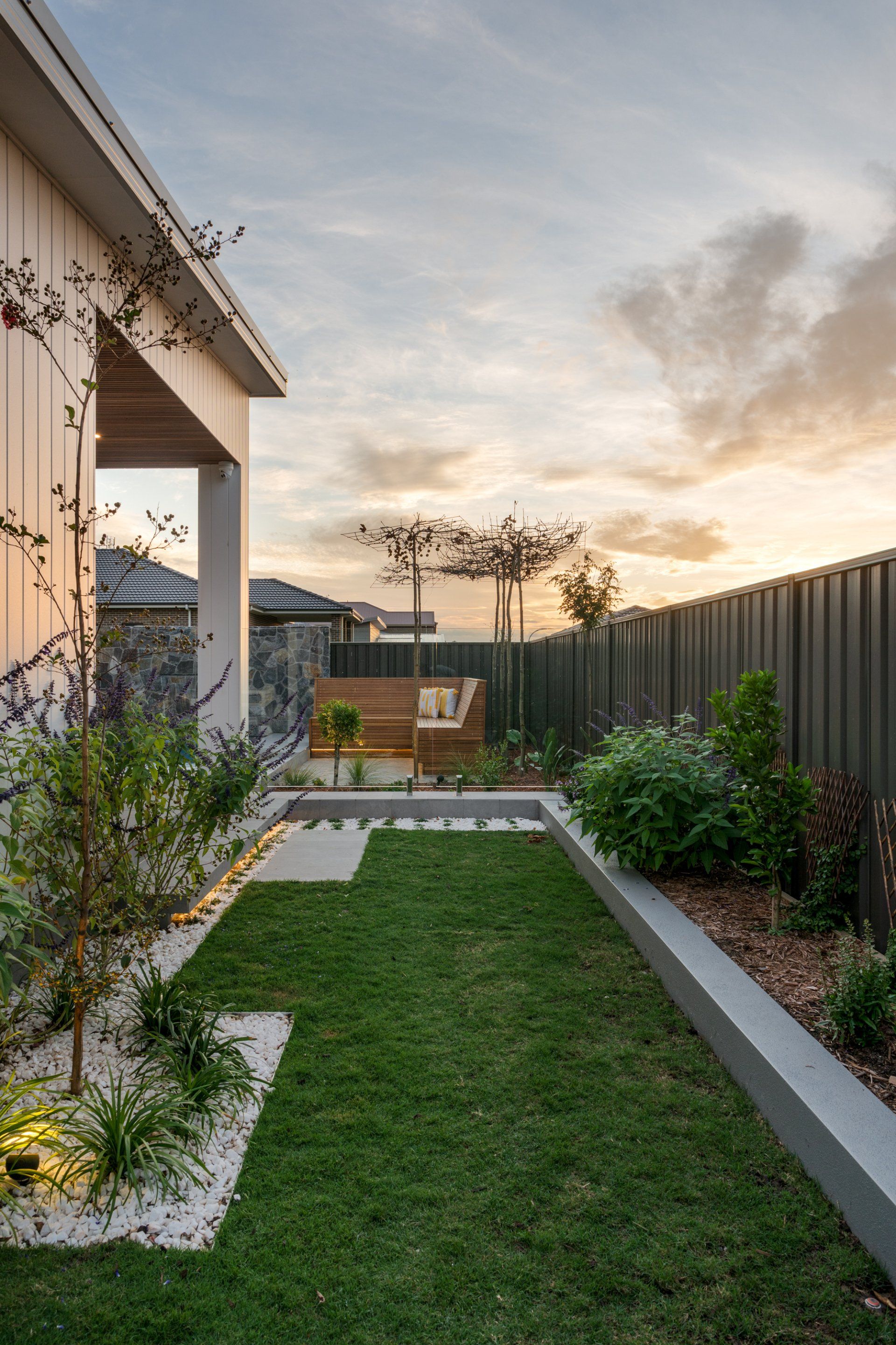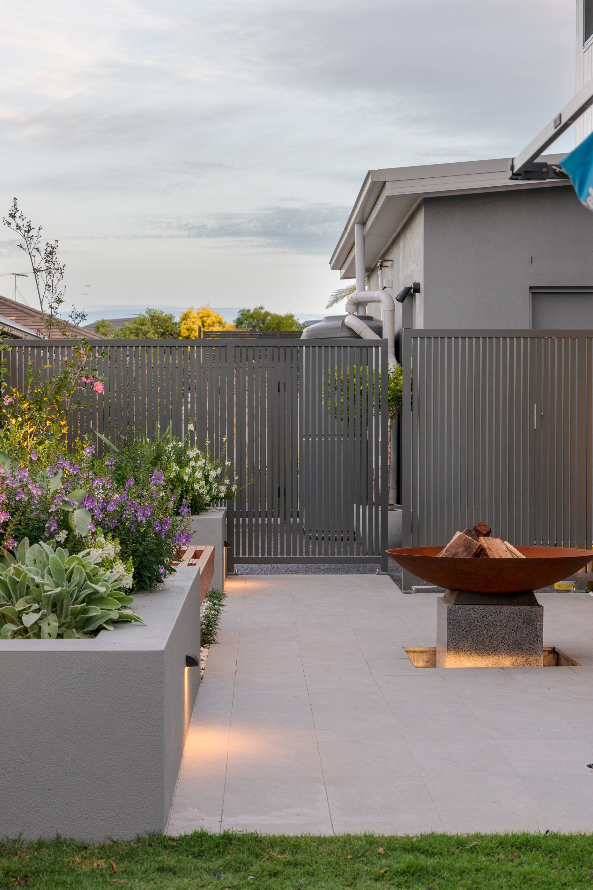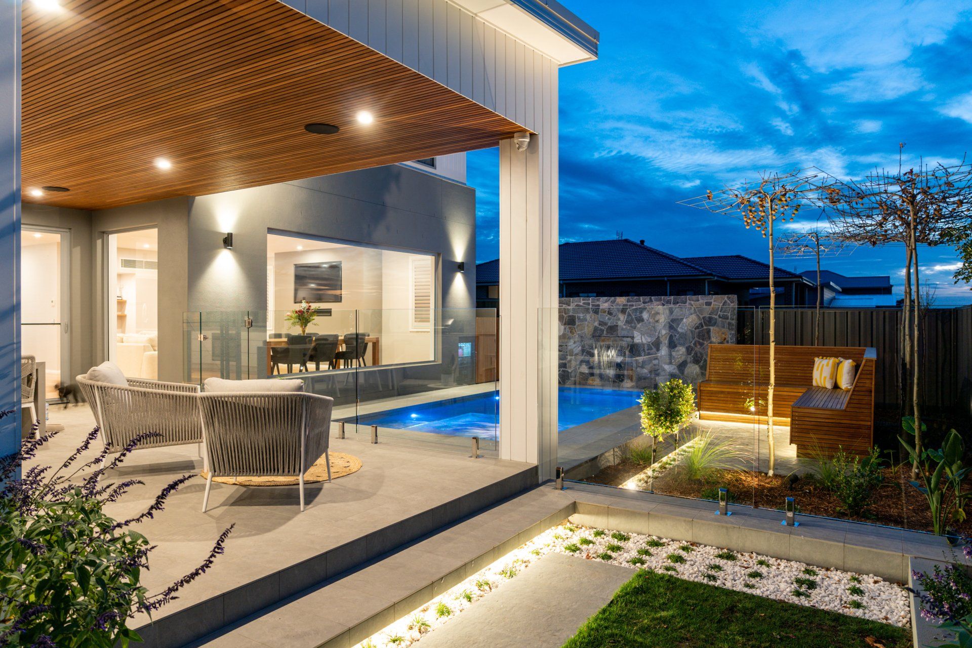 But that’s just the start of it... We completed the day bed seating in the pool area, and the polished concrete fire pit out the back with floating hardwood seating. All the landscaping, paving, fencing, pergola roof and cladding, feature rock cladding, screening etc was designed and completed by our amazing team. We even had our sister company Coastline Pools and Spas do the pool, spa and water feature.