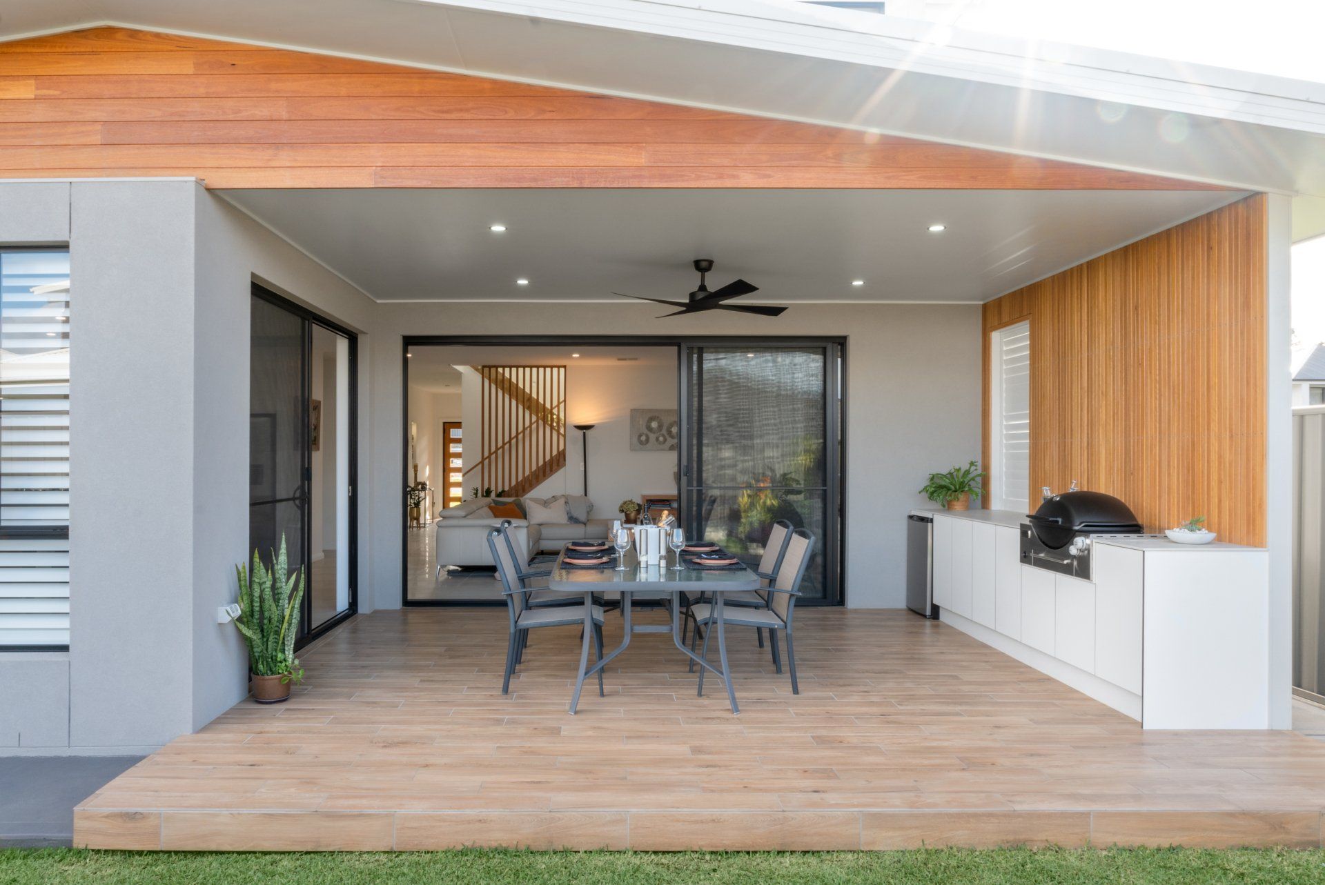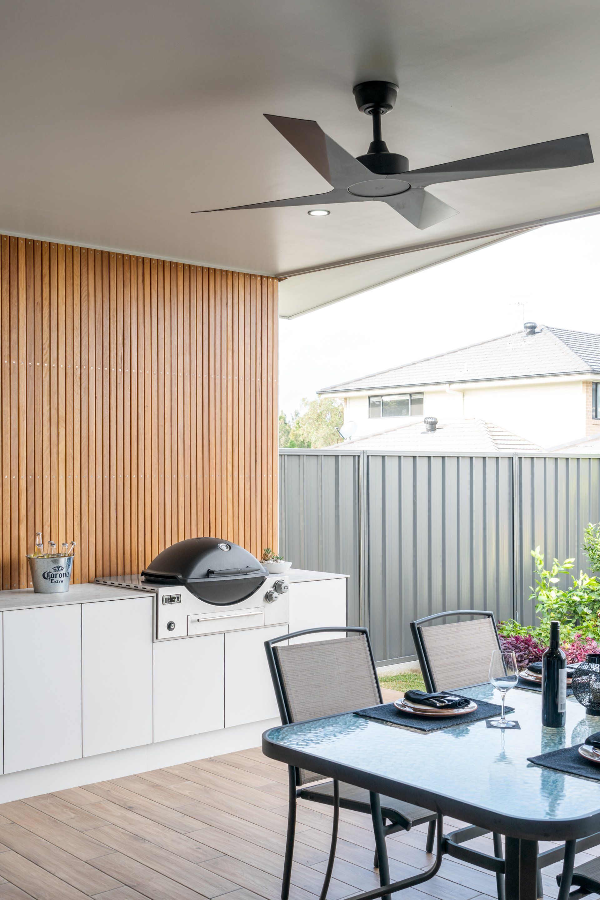 They love to have dinner parties and wanted plenty of room to sit, eat, and drink nice wines with their friends. Then when family birthdays and Christmas rolls around they can open it all up and join the outdoor table up with the dining table and you then have a dinner party for 30. The timber feature wall was a no brainer due to all the nice timber features throughout the home.